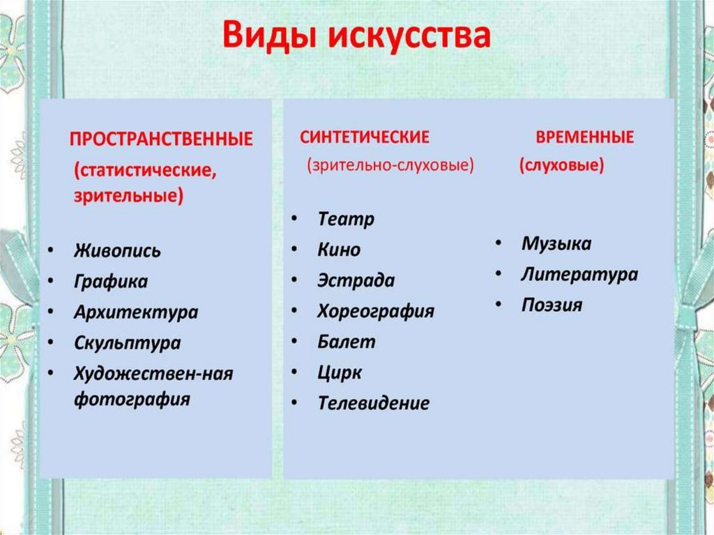 16. Пространственные виды искусства – такие виды искусства, произведения которых: 1. существуют в пространстве, не изменяясь и не