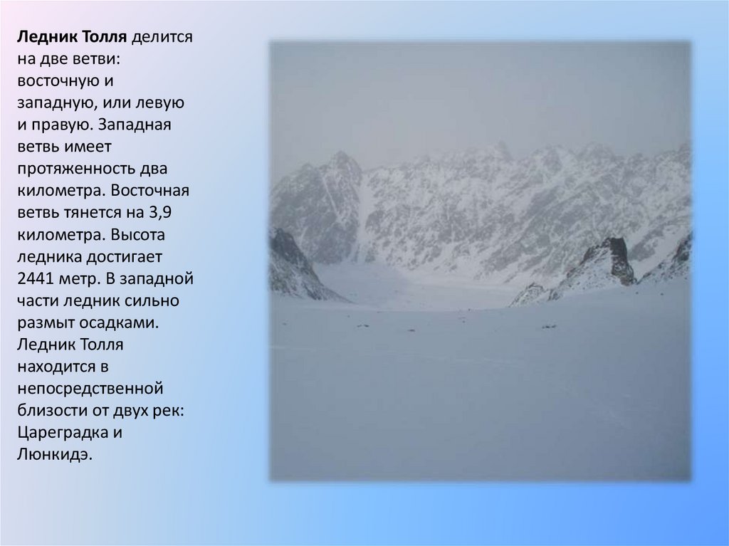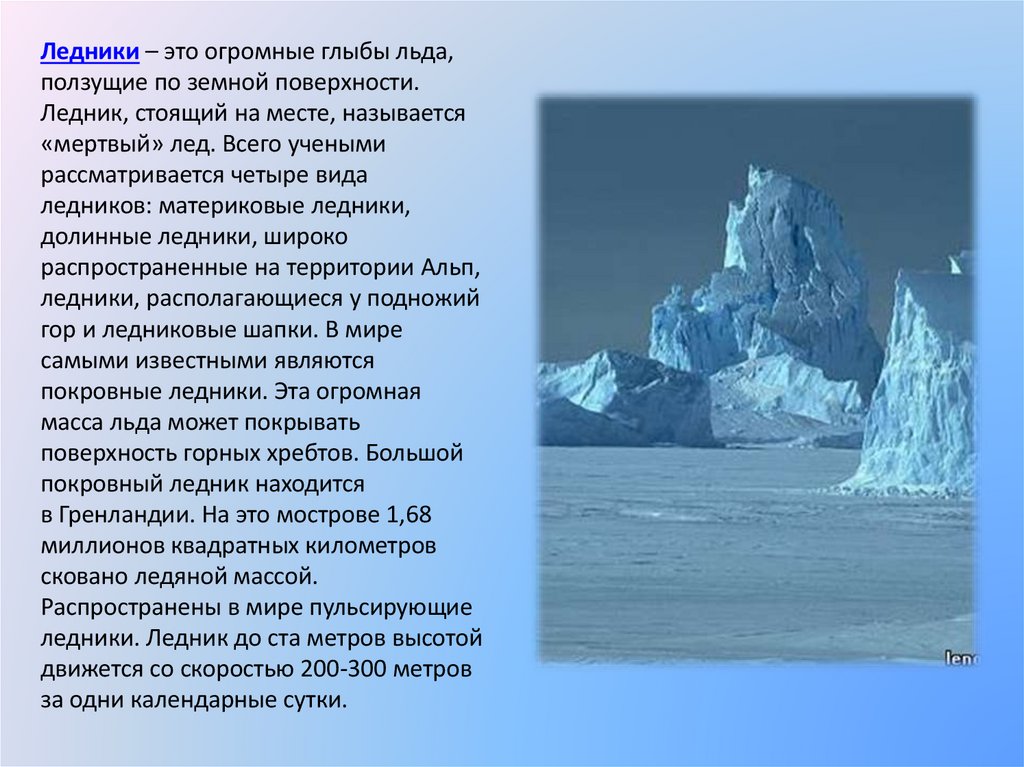 Ледники – это огромные глыбы льда,ползущие по земной поверхности.