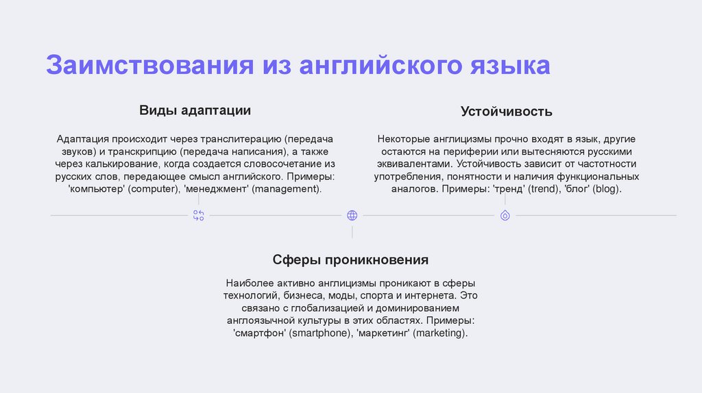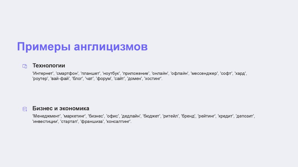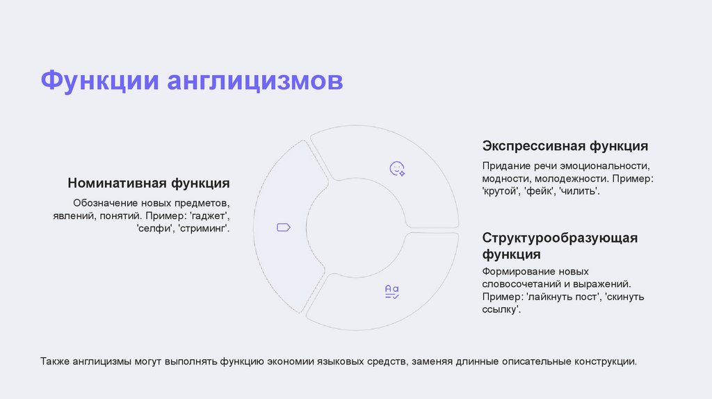 Также англицизмы могут выполнять функцию экономии языковых средств, заменяя длинные описательные конструкции.