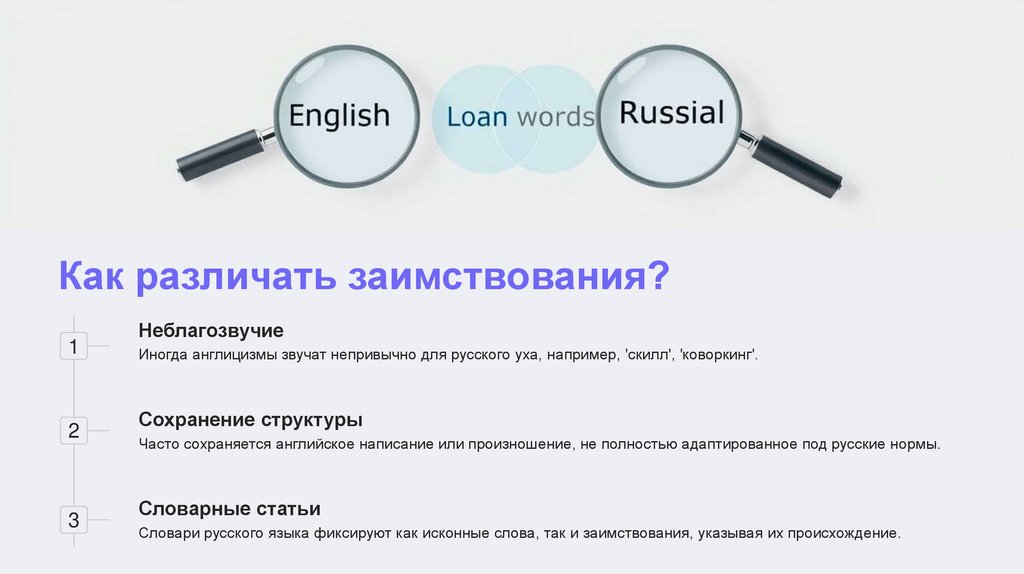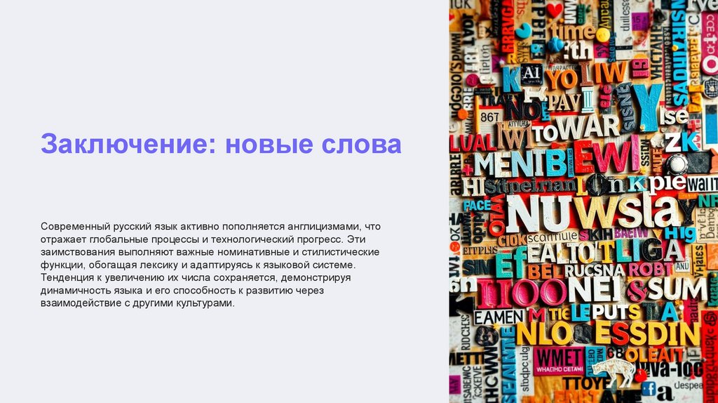 Заключение: новые словаСовременный русский язык активно пополняется англицизмами, что