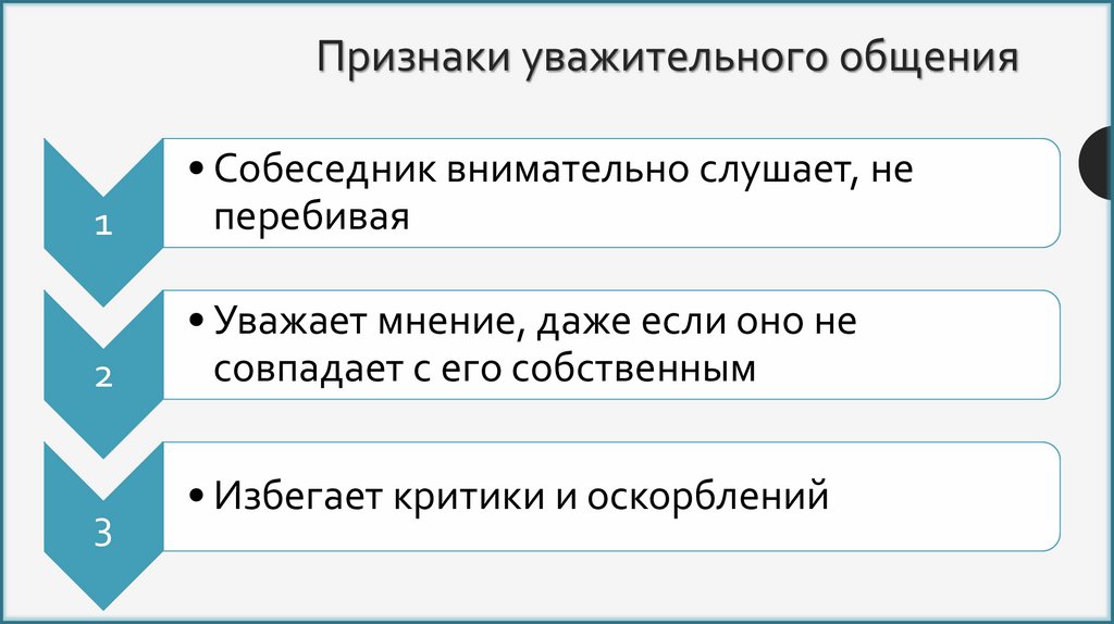 15. Уважение к собеседнику — это основа любого успешного взаимодействия. Оно проявляется в признании права другого человека на свою