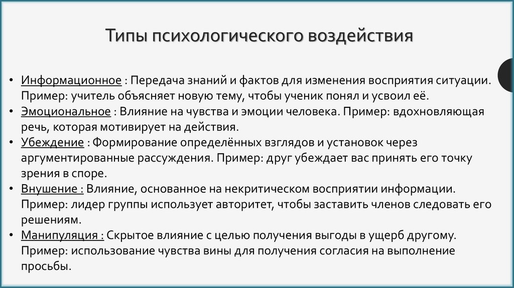 Типы психологического воздействия• Информационное : Передача знаний и фактов для изменения восприятия ситуации.