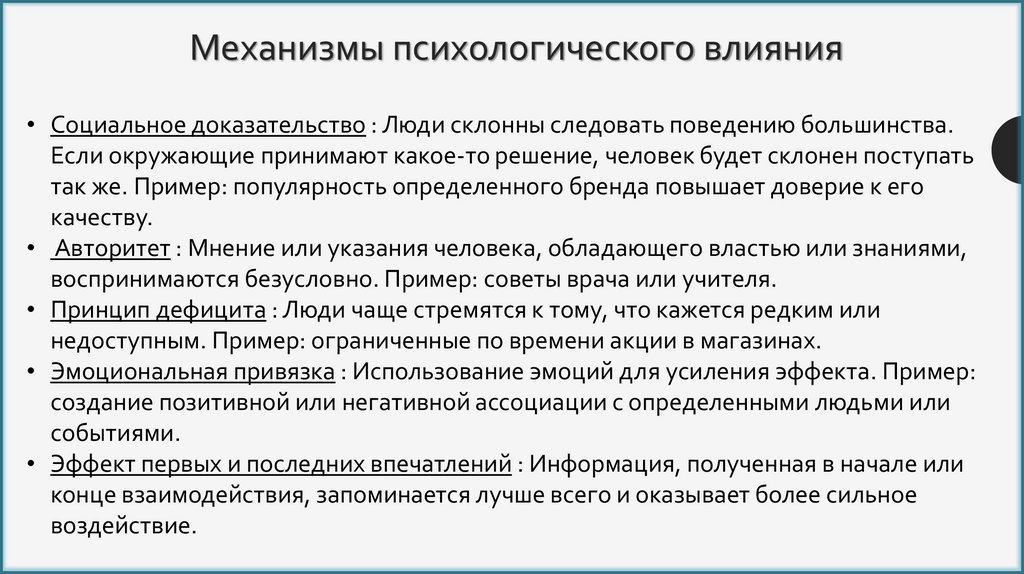 Механизмы психологического влияния• Социальное доказательство : Люди склонны следовать поведению большинства.