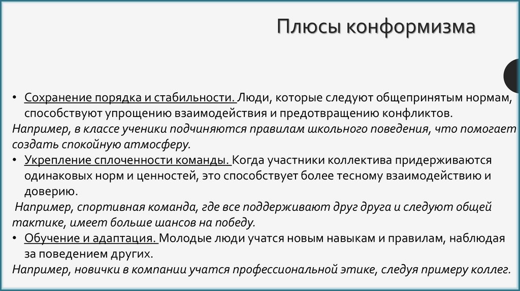Плюсы конформизма• Сохранение порядка и стабильности. Люди, которые следуют общепринятым нормам,