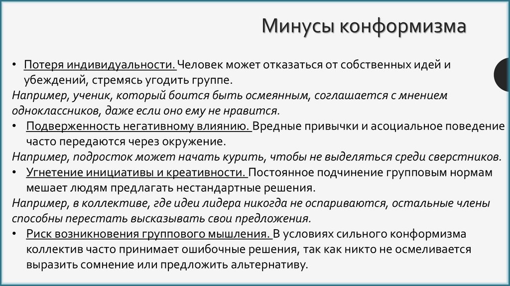 Минусы конформизма• Потеря индивидуальности. Человек может отказаться от собственных идей и