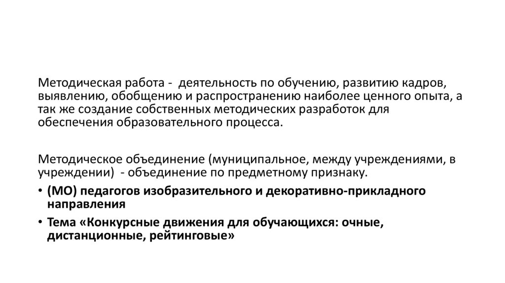 Методическая работа - деятельность по обучению, развитию кадров,выявлению, обобщению и распространению наиболее ценного опыта, а