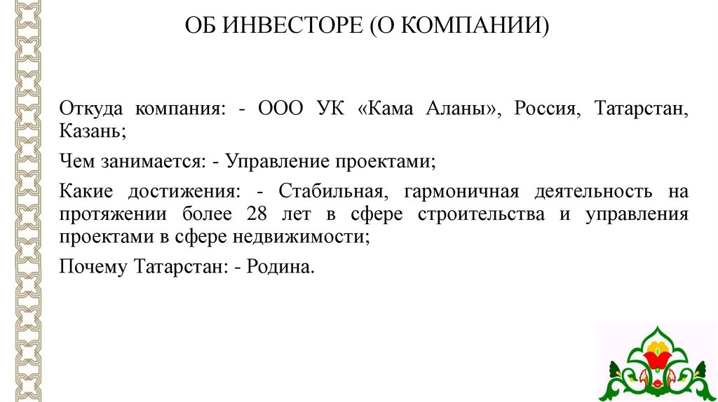 ОБ ИНВЕСТОРЕ (О КОМПАНИИ)Откуда компания: - ООО УК «Кама Аланы», Россия, Татарстан,