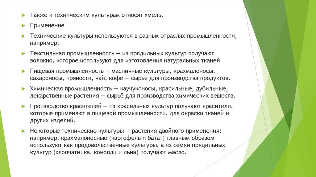 Также к техническим культурам относят хмель.Применение
