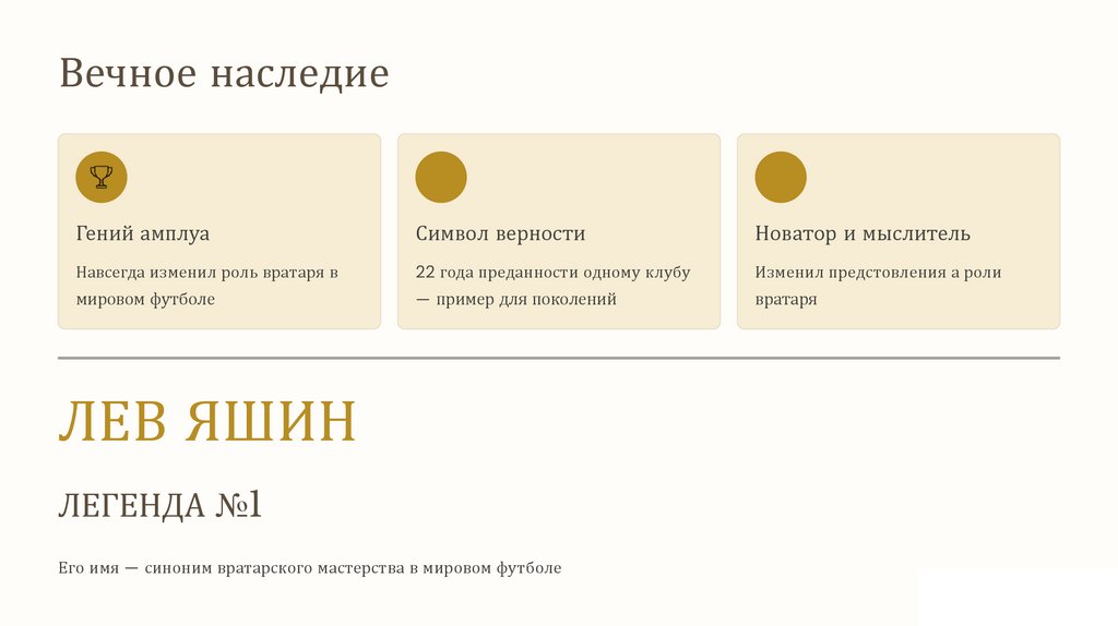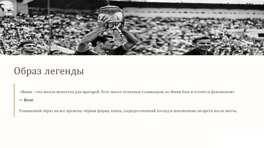 Образ легенды«Яшин –это школа мужества для вратарей. Есть много отличных голкиперов, но Яшин был и остаётся феноменом».