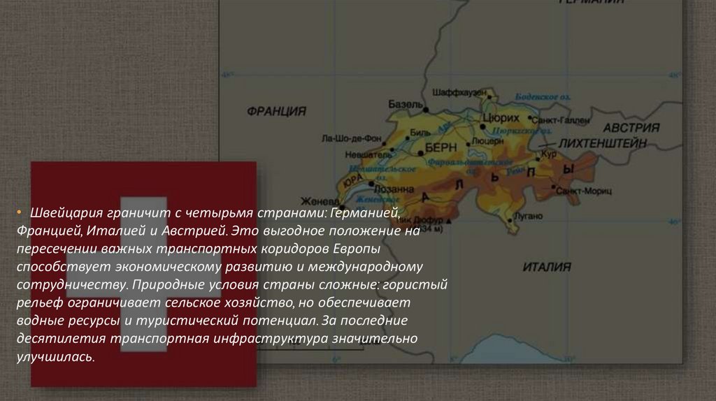 • Швейцария граничит с четырьмя странами: Германией,Францией, Италией и Австрией. Это выгодное положение на