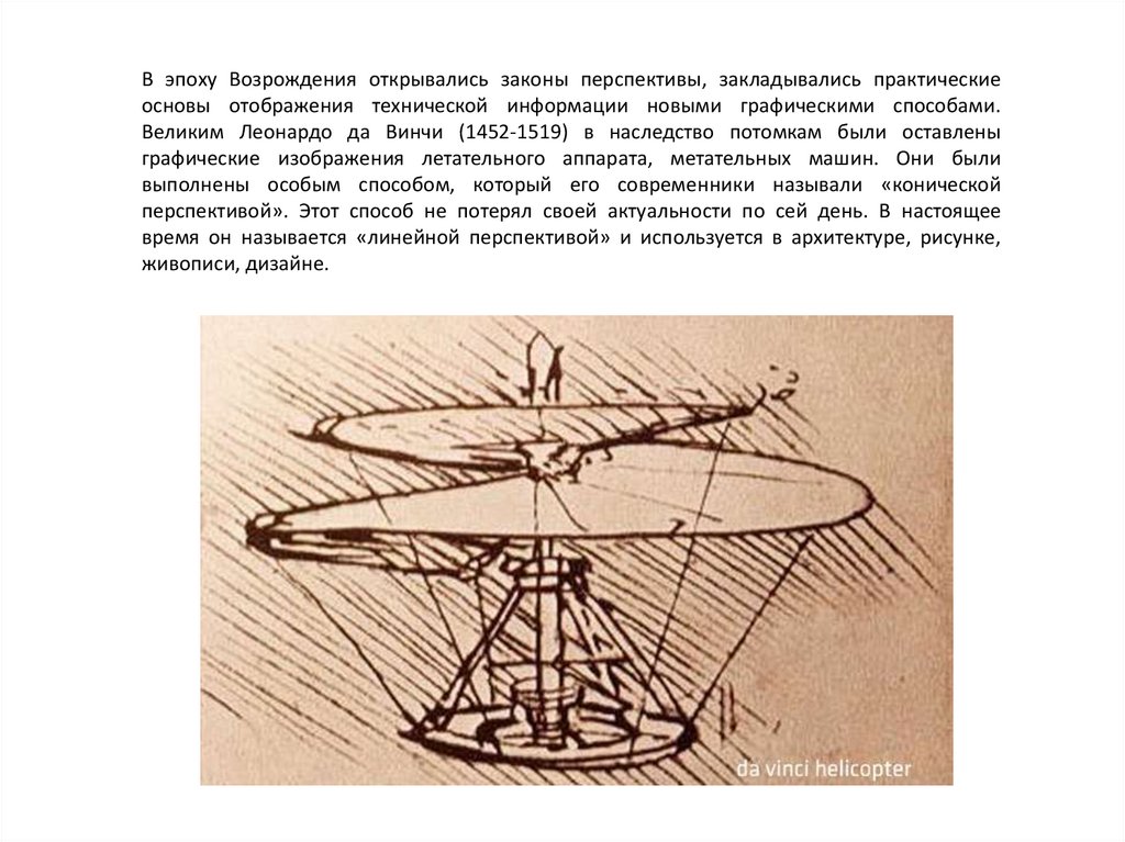 В эпоху Возрождения открывались законы перспективы, закладывались практическиеосновы отображения технической информации новыми графическими способами.