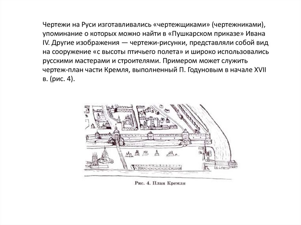 Чертежи на Руси изготавливались «чертежщиками» (чертежниками),упоминание о которых можно найти в «Пушкарском приказе» Ивана