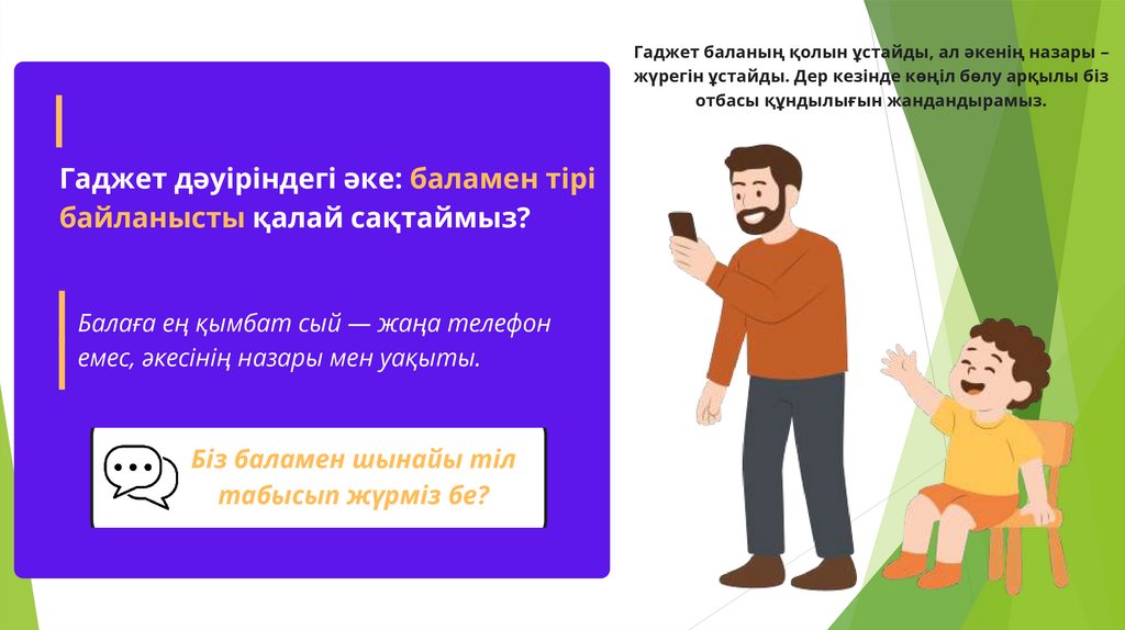 Гаджет баланың қолын ұстайды, ал әкенің назары –жүрегін ұстайды. Дер кезінде көңіл бөлу арқылы біз