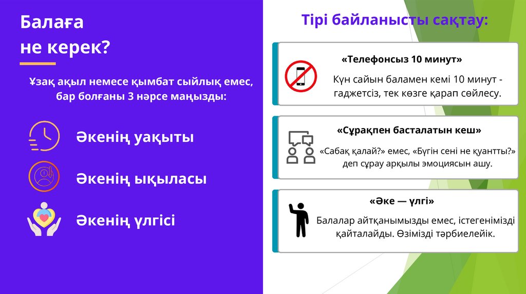 Күн сайын баламен кемі 10 минут гаджетсіз, тек көзге қарап сөйлесу.