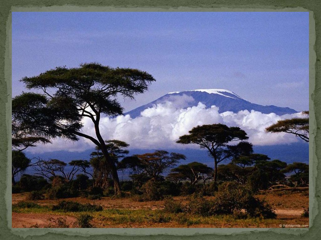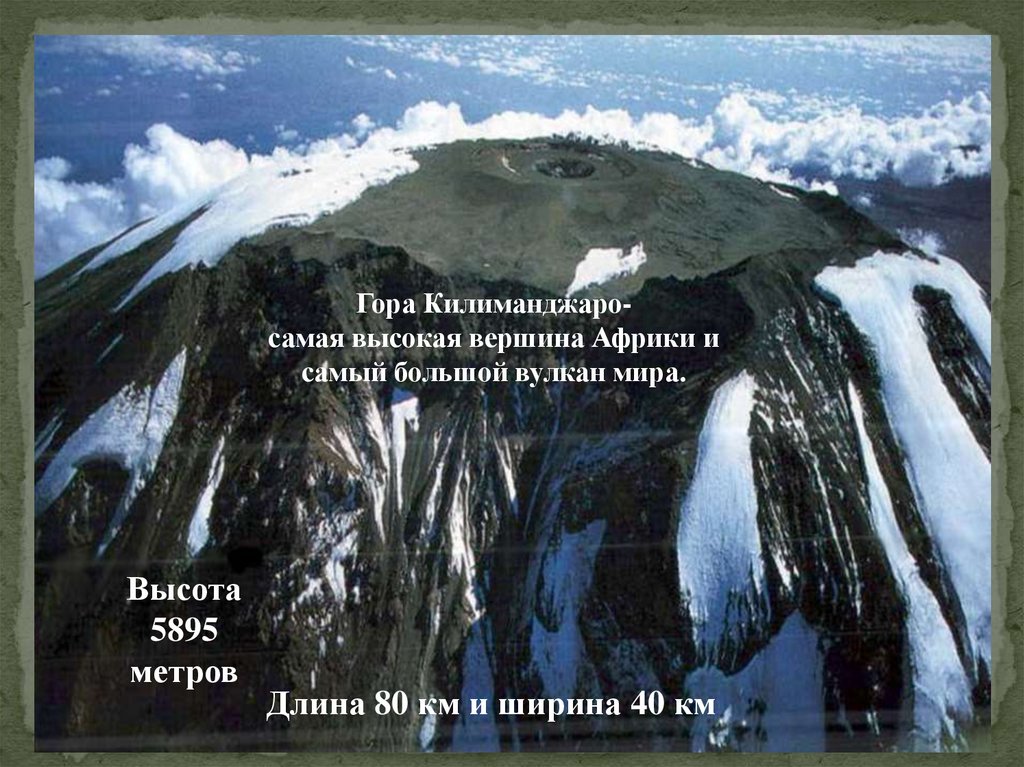 Гора Килиманджаросамая высокая вершина Африки исамый большой вулкан мира.