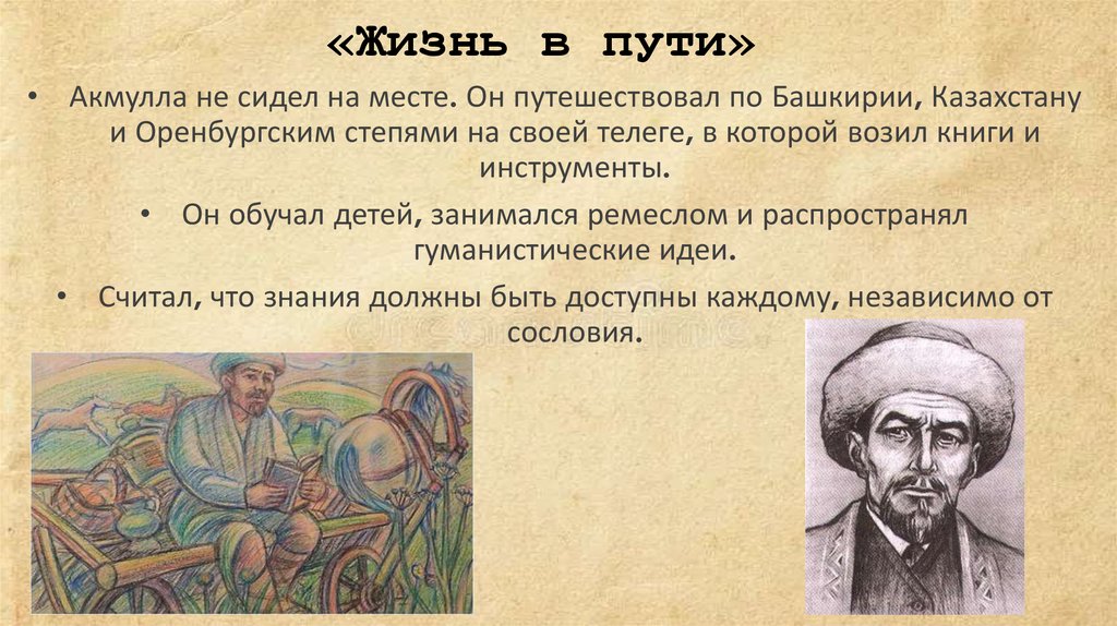«Жизнь в пути»• Акмулла не сидел на месте. Он путешествовал по Башкирии, Казахстану