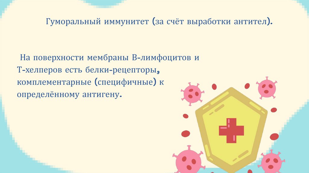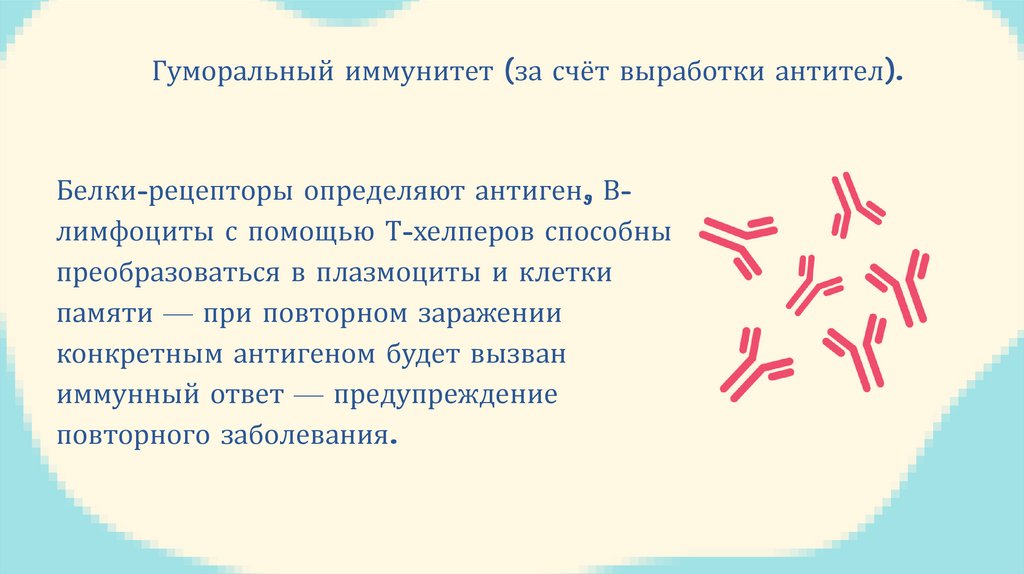 Гуморальный иммунитет (за счёт выработки антител).Белки-рецепторы определяют антиген, Влимфоциты с помощью Т-хелперов способны