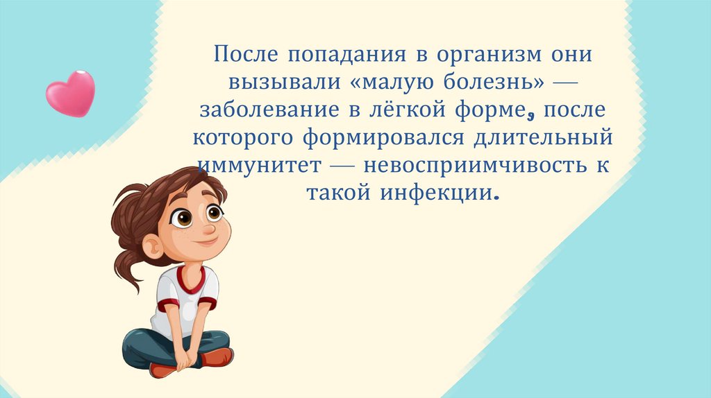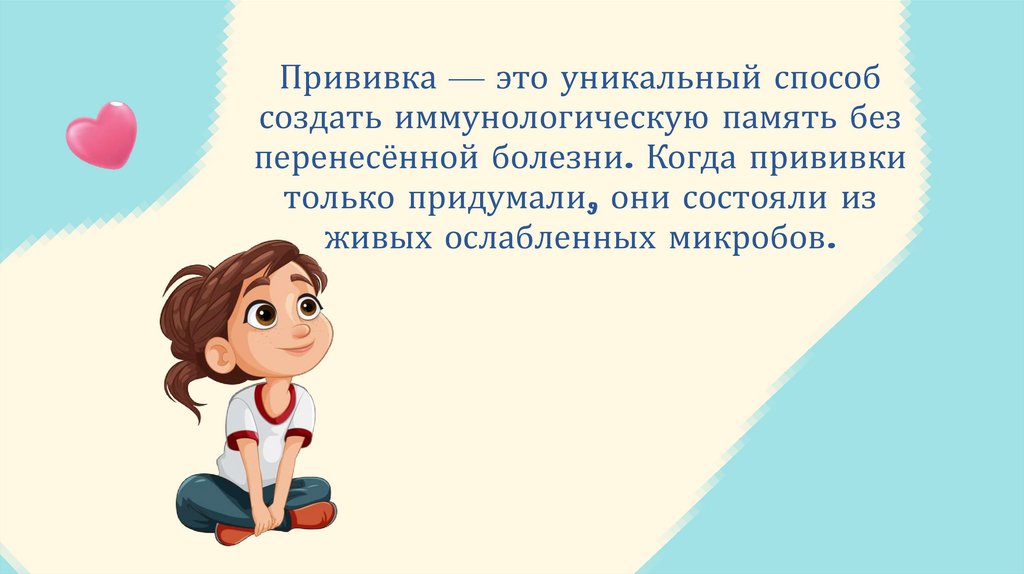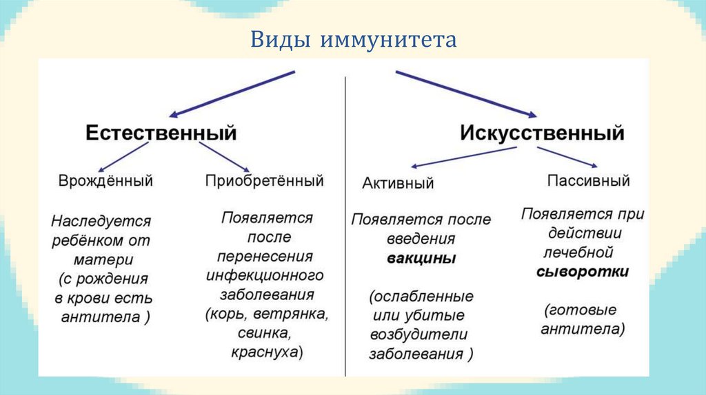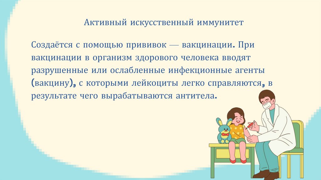 Активный искусственный иммунитетСоздаётся с помощью прививок — вакцинации. При