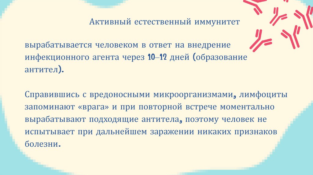Активный естественный иммунитетвырабатывается человеком в ответ на внедрение