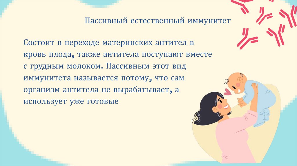 Пассивный естественный иммунитетСостоит в переходе материнских антител в