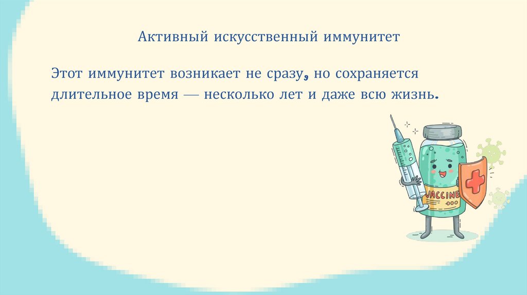 Активный искусственный иммунитетЭтот иммунитет возникает не сразу, но сохраняется