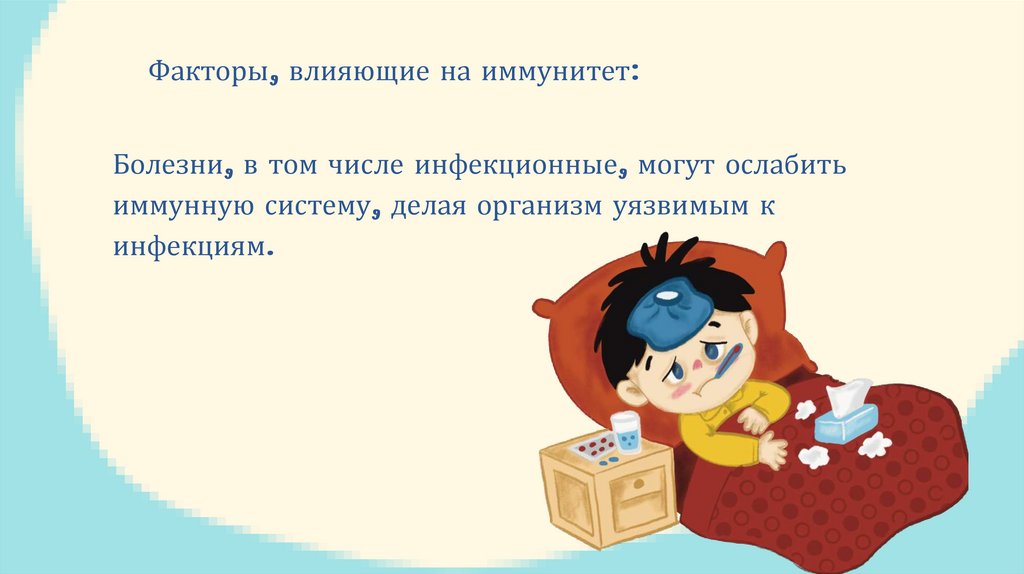 Факторы, влияющие на иммунитет:Болезни, в том числе инфекционные, могут ослабить