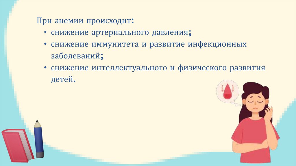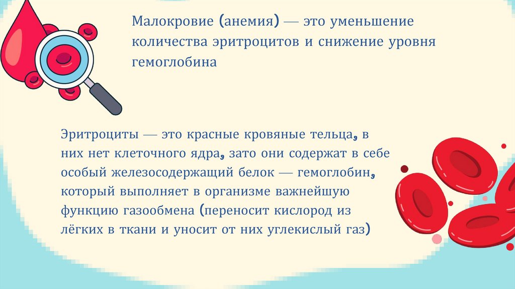 Малокровие (анемия) — это уменьшениеколичества эритроцитов и снижение уровня