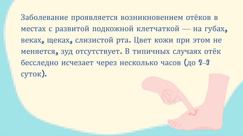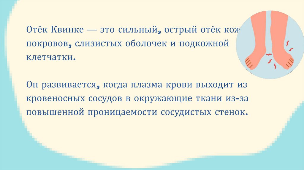 Отёк Квинке — это сильный, острый отёк кожныхпокровов, слизистых оболочек и подкожной
