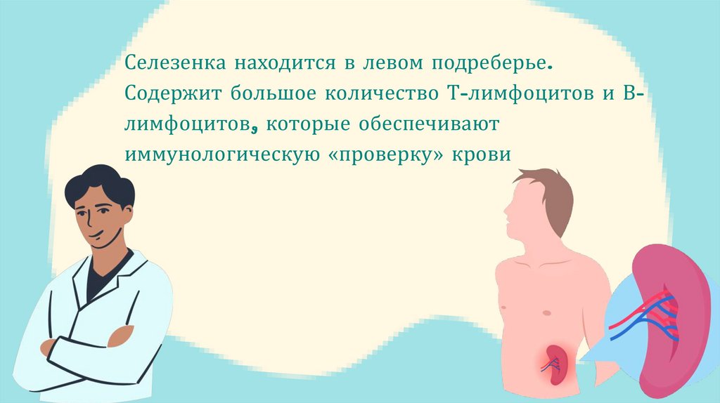 Селезенка находится в левом подреберье.Содержит большое количество Т-лимфоцитов и Влимфоцитов, которые обеспечивают