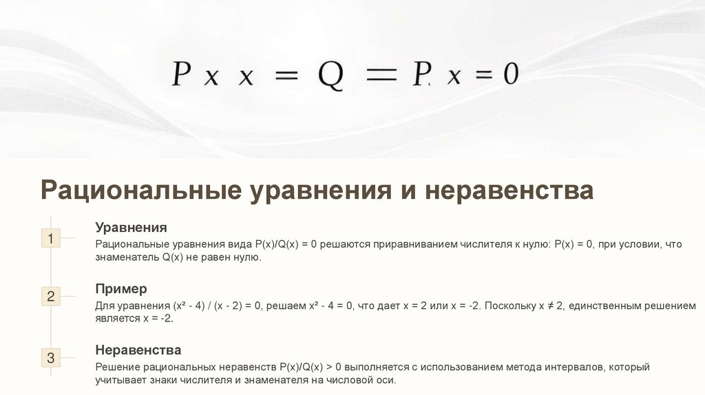 Рациональные уравнения вида P(x)/Q(x) = 0 решаются приравниванием числителя к нулю: P(x) = 0, при условии, что