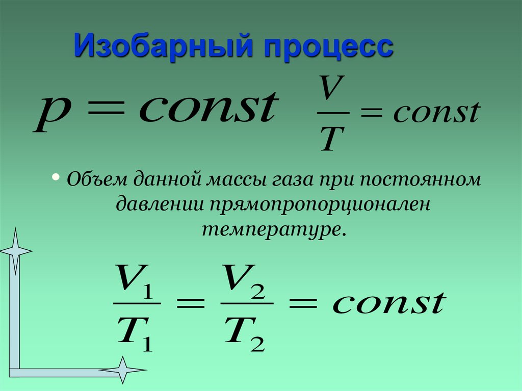 Изобарный процесс – процесс изменения состоянияопределенной массы газа при постоянном давлении.