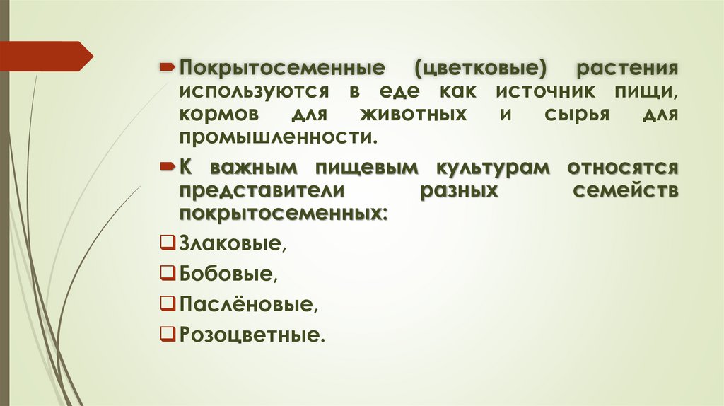 Покрытосеменные (цветковые) растенияиспользуются в еде как источник пищи,