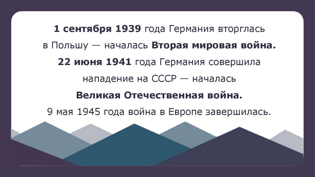 1 сентября 1939 года Германия вторгласьв Польшу — началась Вторая мировая война.