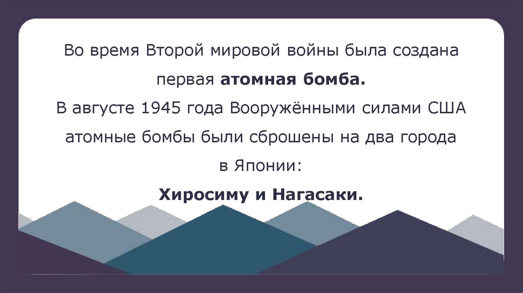 Во время Второй мировой войны была созданапервая атомная бомба.