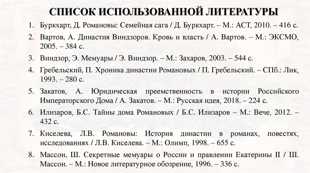 СПИСОК ИСПОЛЬЗОВАННОЙ ЛИТЕРАТУРЫ1. Буркхарт, Д. Романовы: Семейная сага / Д. Буркхарт. – М.: АСТ, 2010. – 416 с.