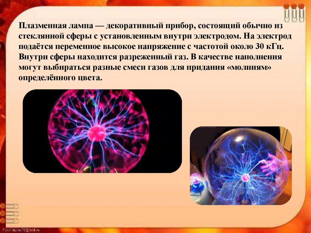 Плазменная лампа — декоративный прибор, состоящий обычно изстеклянной сферы с установленным внутри электродом. На электрод
