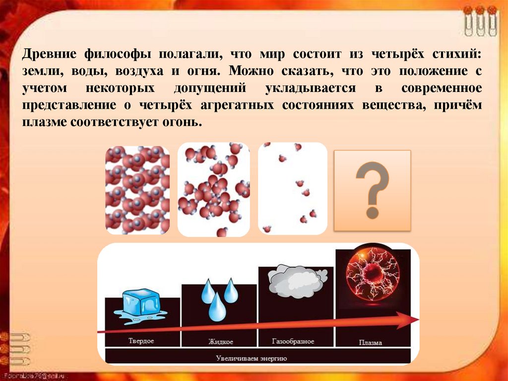 представление о четырёх агрегатных состояниях вещества, причём