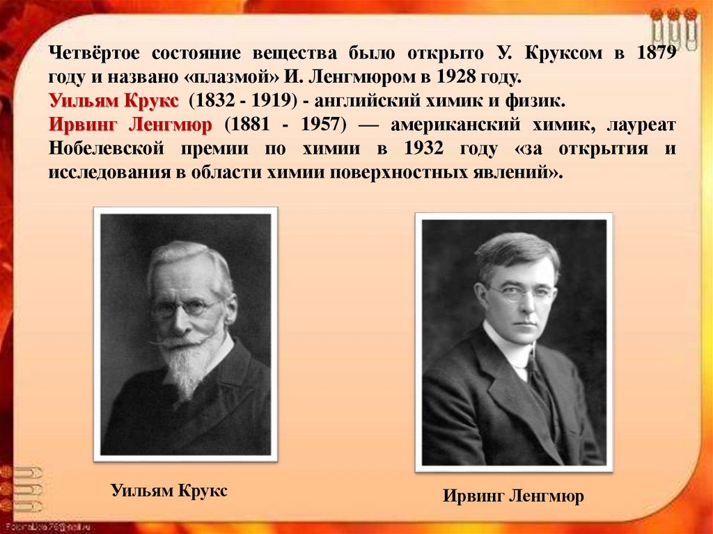 Четвёртое состояние вещества было открыто У. Круксом в 1879году и названо «плазмой» И. Ленгмюром в 1928 году.