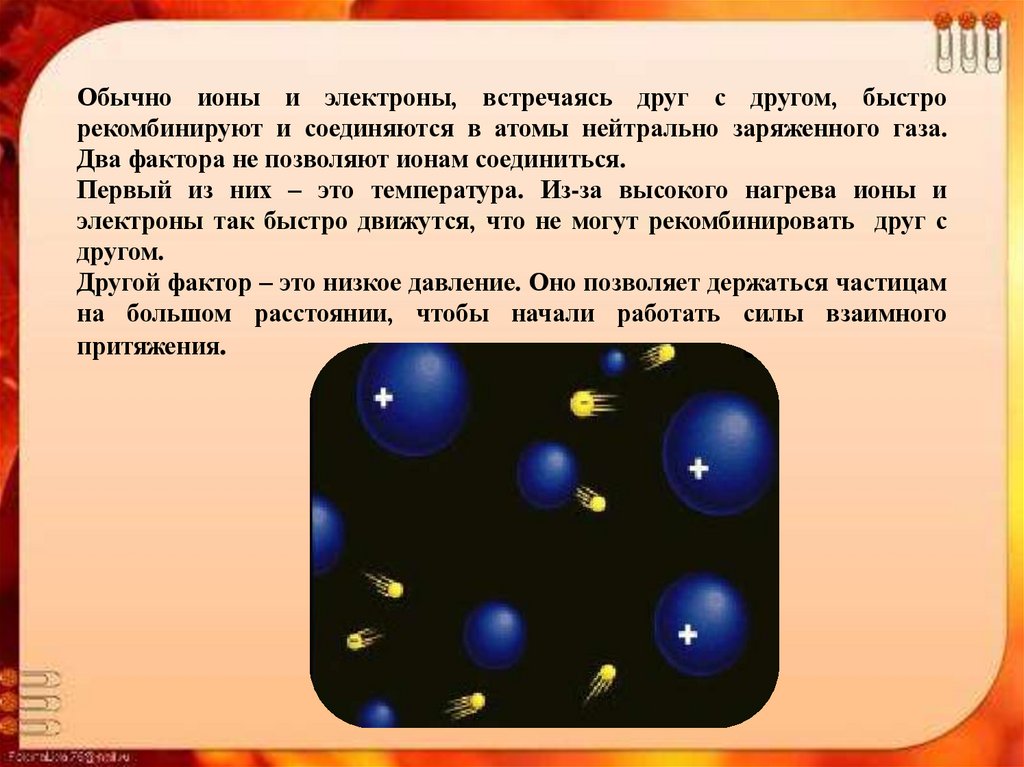 Обычно ионы и электроны, встречаясь друг с другом, быстрорекомбинируют и соединяются в атомы нейтрально заряженного газа.