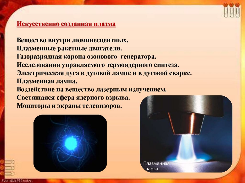 Искусственно созданная плазмаВещество внутри люминесцентных.