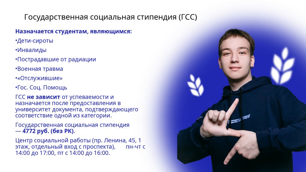 Государственная социальная стипендия (ГСС)Назначается студентам, являющимся: