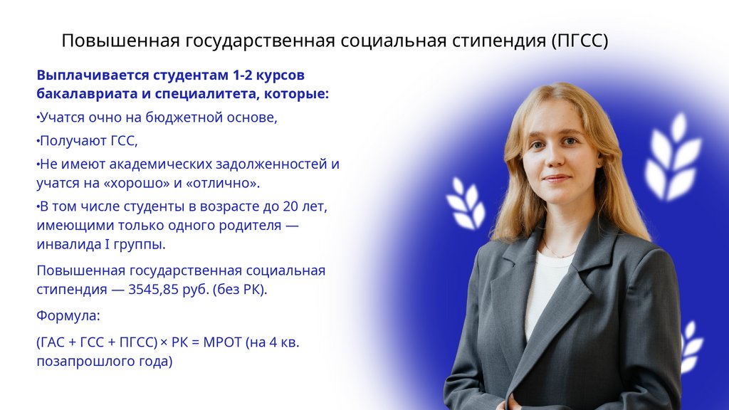Повышенная государственная социальная стипендия (ПГСС)Выплачивается студентам 1-2 курсов