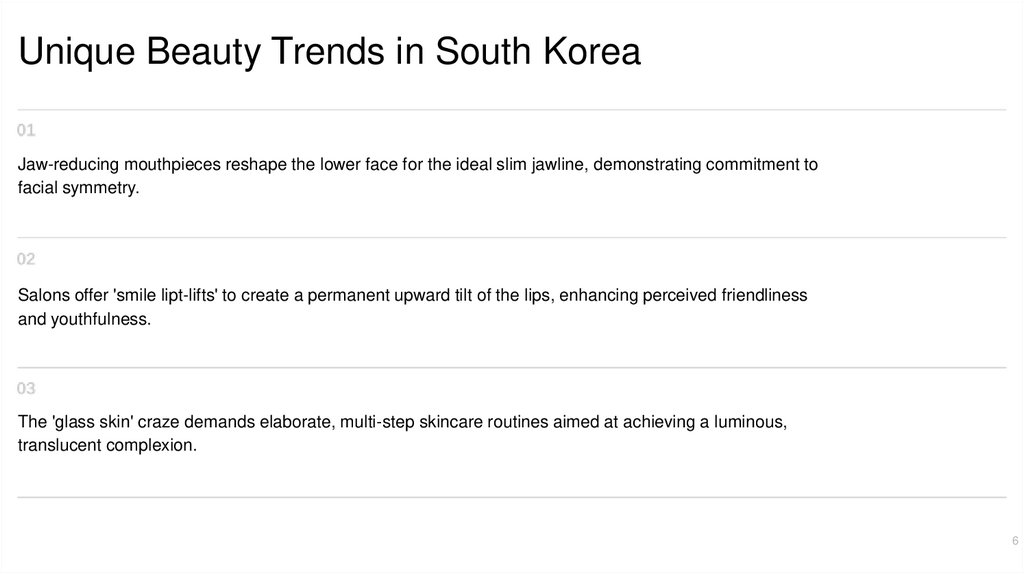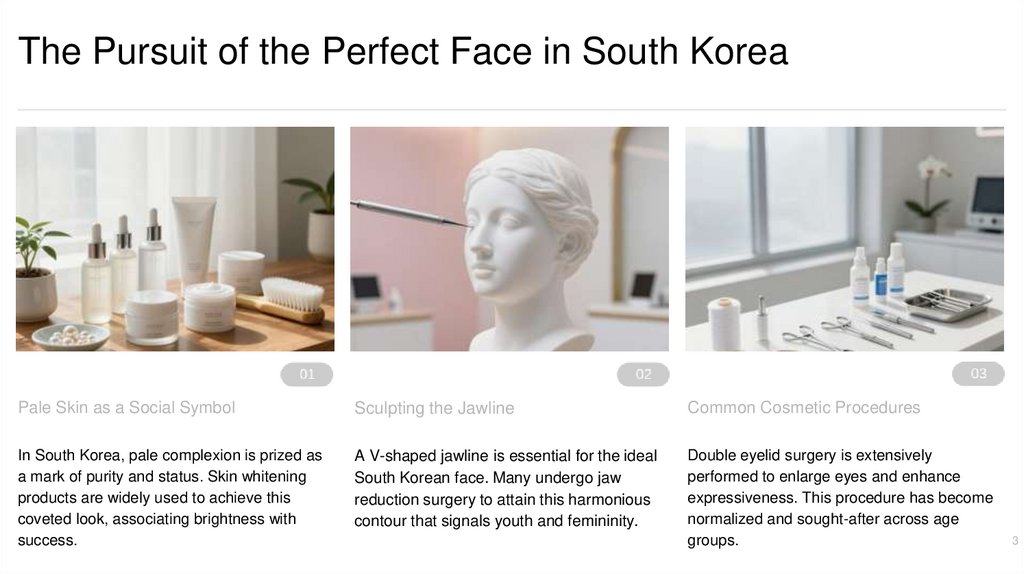 Cultural Foundations of BeautySouth Korea emphasizes flawless facial features and