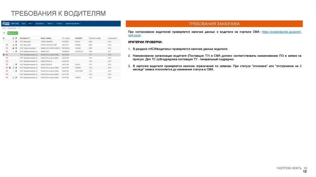 При согласовании водителей проверяется наличие данных о водителе на портале СМА: https://smabrdportal.gazpromneft.local/