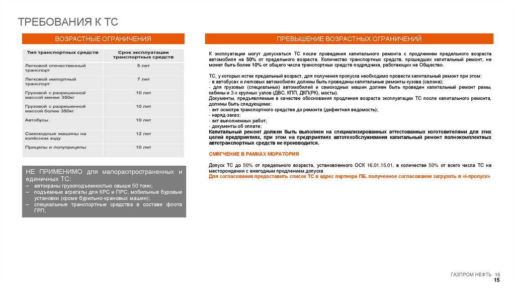 Допуск ТС до 50% от предельного возраста, установленного ОСК 16.01.15.01, в количестве 50% от всего числа ТС на