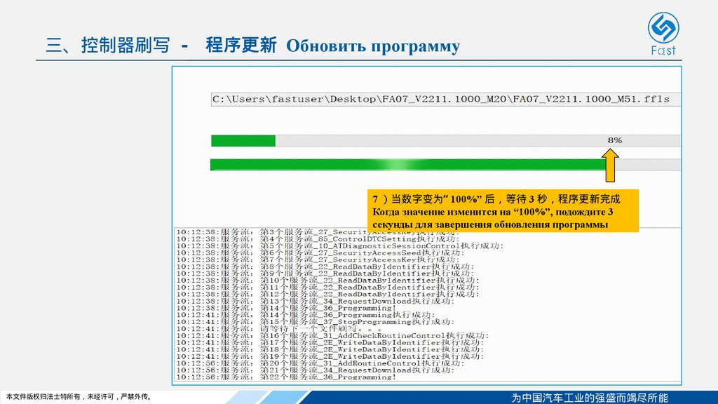 三、控制器刷写 - 程序更新 Обновить программу7 当数字变为“ 100%” 后 等待 3 秒 程序更新完成