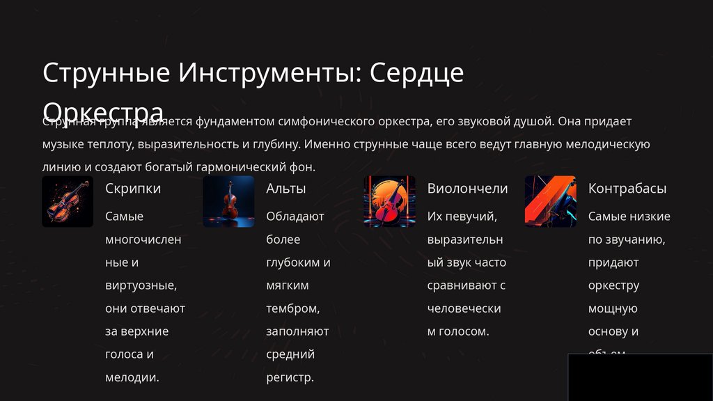 музыке теплоту, выразительность и глубину. Именно струнные чаще всего ведут главную мелодическую