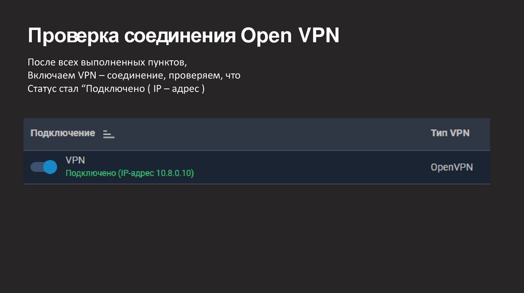 Проверка соединения Open VPNПосле всех выполненных пунктов,