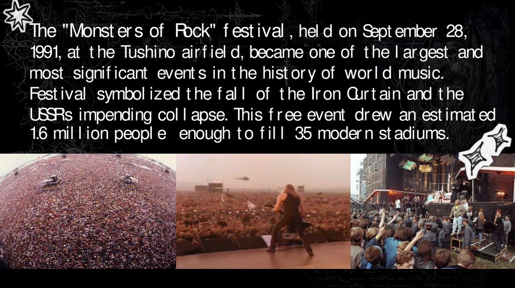 The "Monsters of Rock" festival, held on September 28,1991, at the Tushino airfield, became one of the largest and