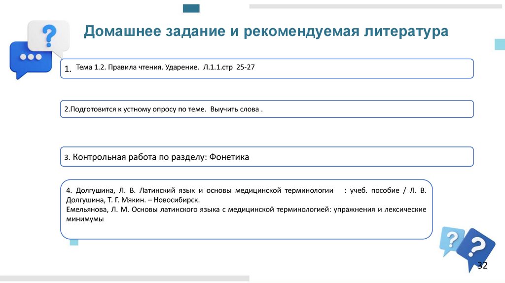 Домашнее задание и рекомендуемая литература1. Тема 1.2. Правила чтения. Ударение. Л.1.1.стр 25-27